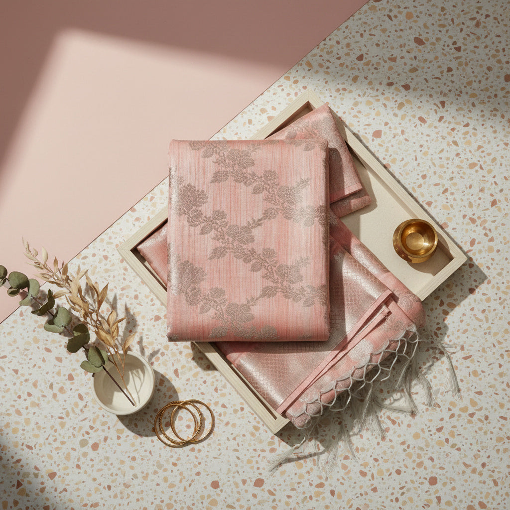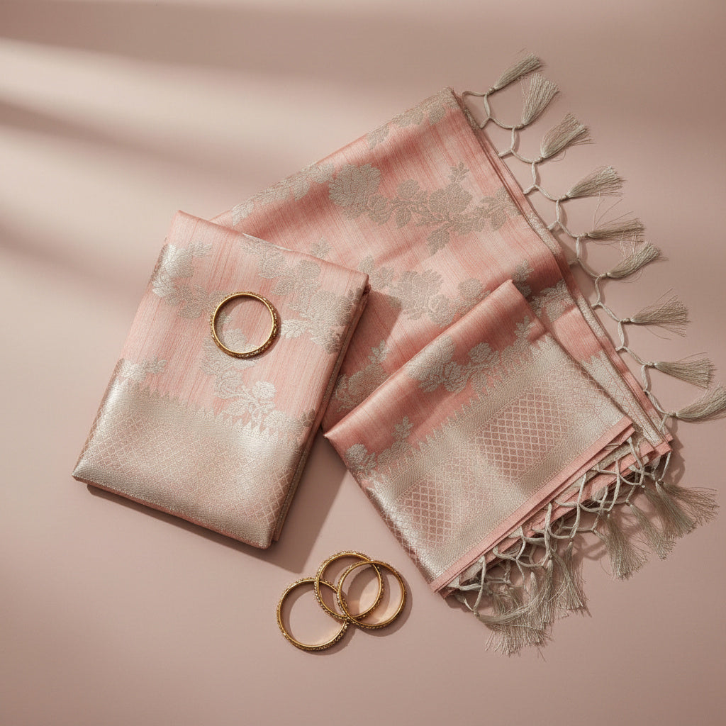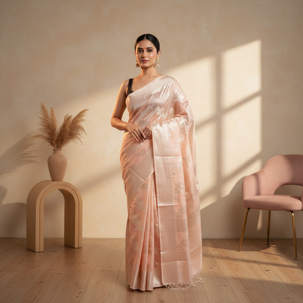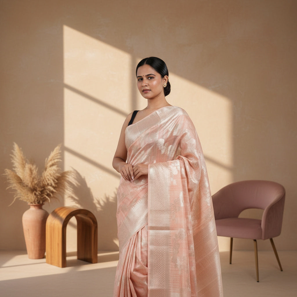 Introducing Anaya, an elegant cotton silk saree crafted in a serene soft-peach tone with delicate gold zari floral motifs woven across the body. Designed for women who love understated luxury, this saree blends the comfort of cotton with the sheen of silk — making it perfect for both everyday sophistication and special celebrations.