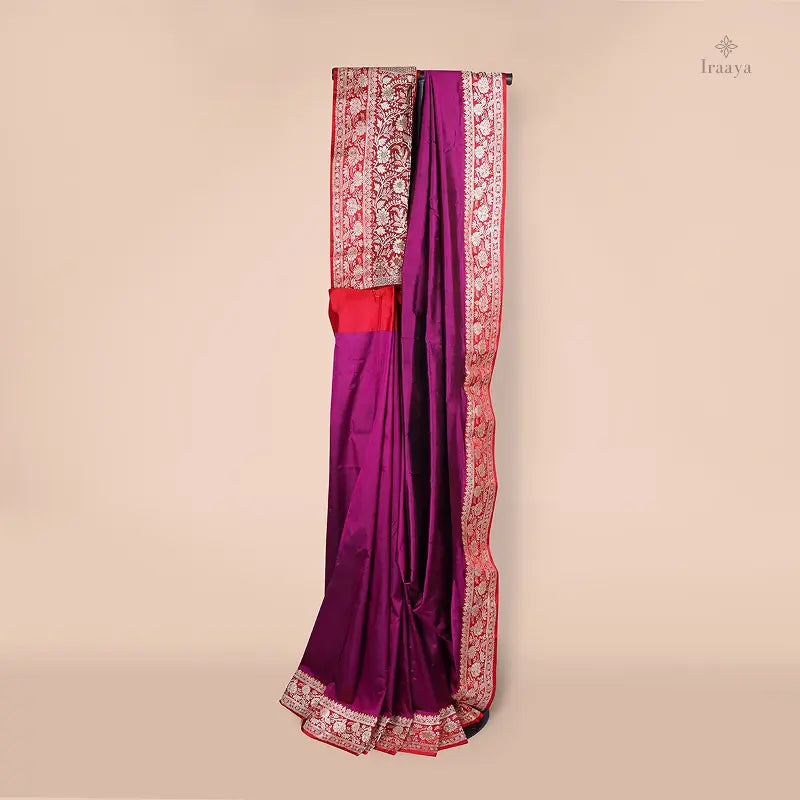 Color Palette: Royal rani pink body with a red accent and intricate zari border