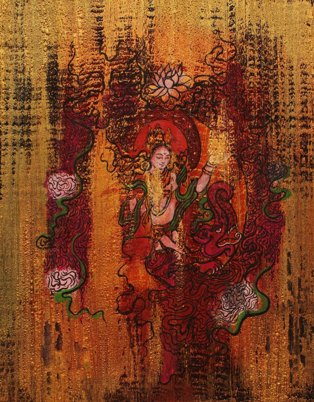 The dancing form evokes Nritta, the spiritual movement found in both Hindu and Buddhist art traditions — signifying the dissolution of ego into rhythm.