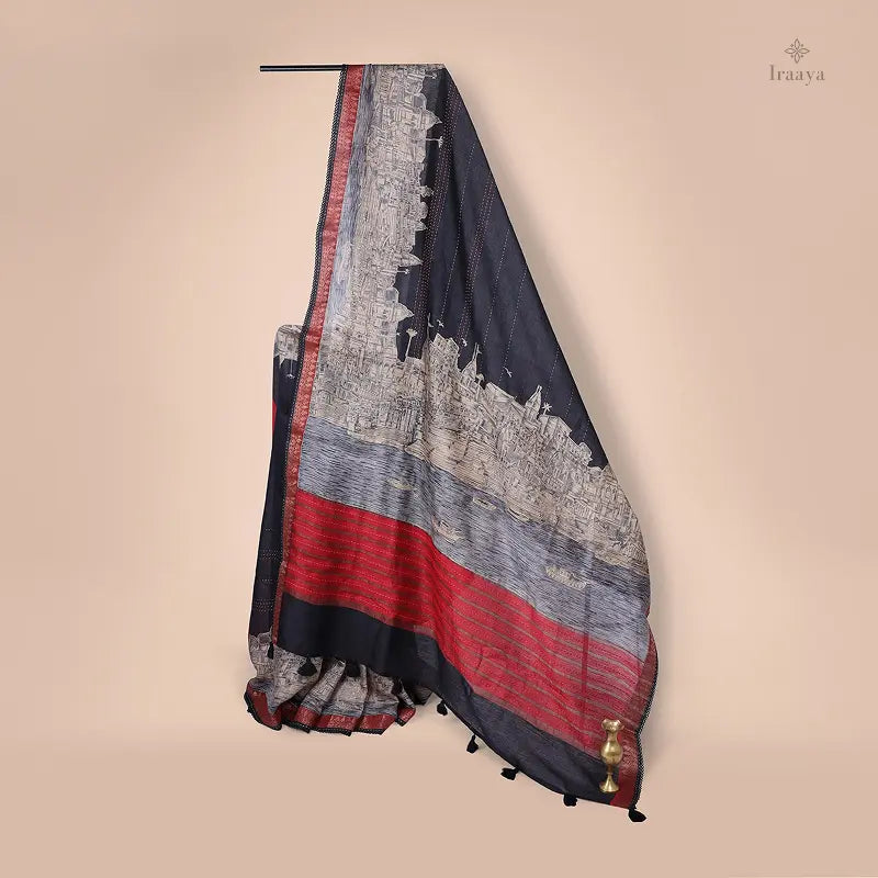Crafted in pure Muga Tussar silk, Dharini captures the soul of Kolkata’s riverbanks through delicate, hand-drawn sketch prints. The pallu unfolds like a memory, temples, boats, stairways, etched in fluid lines, bordered in charcoal and vermilion.