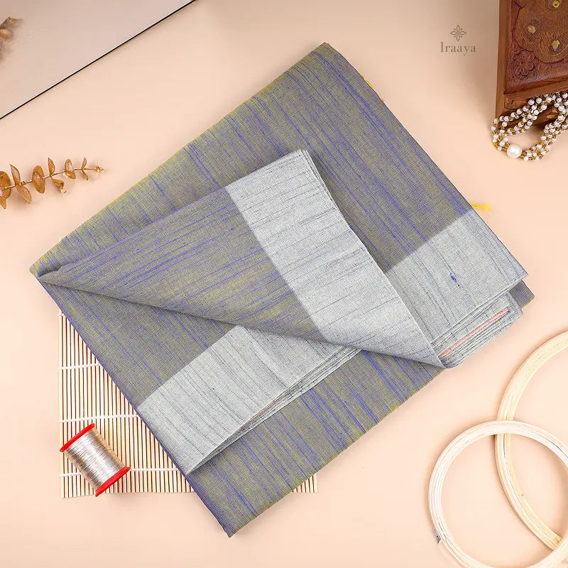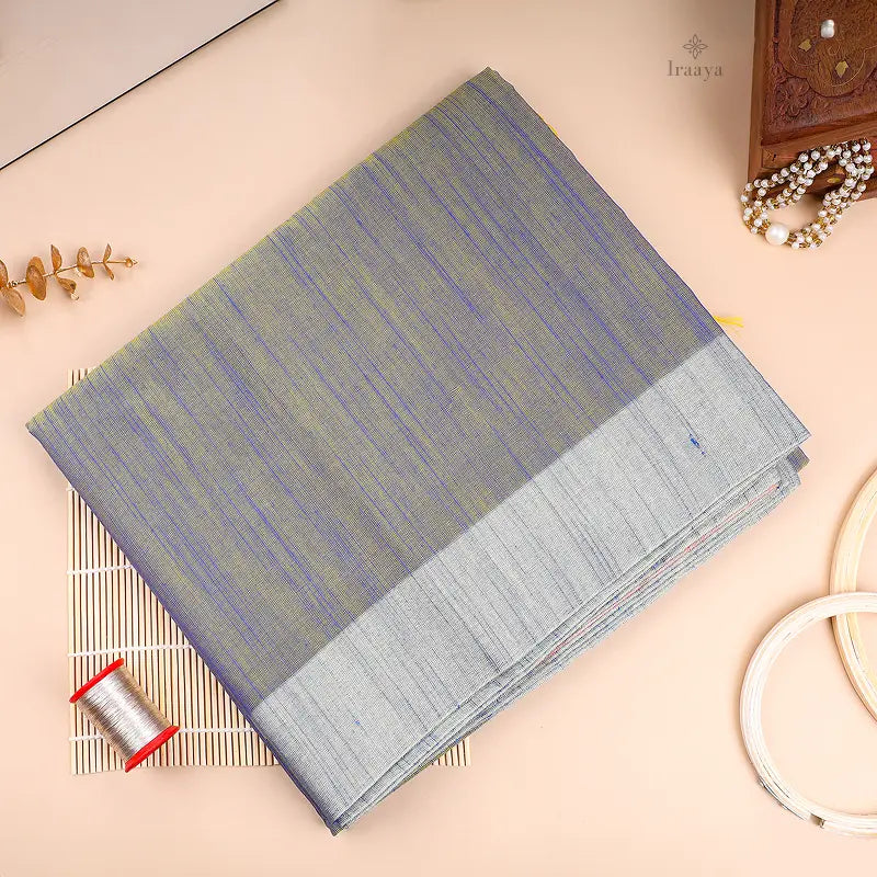 Neeraja is crafted in airy Khadi tissue, where sage green and lavender threads blend into a serene grey-blue body. A soft silver border and handwoven texture give this saree its quiet beauty, perfect for minimalist occasions and mindful wardrobes.
