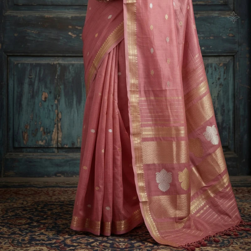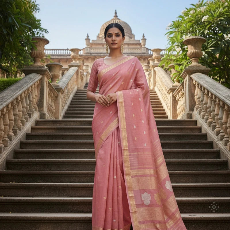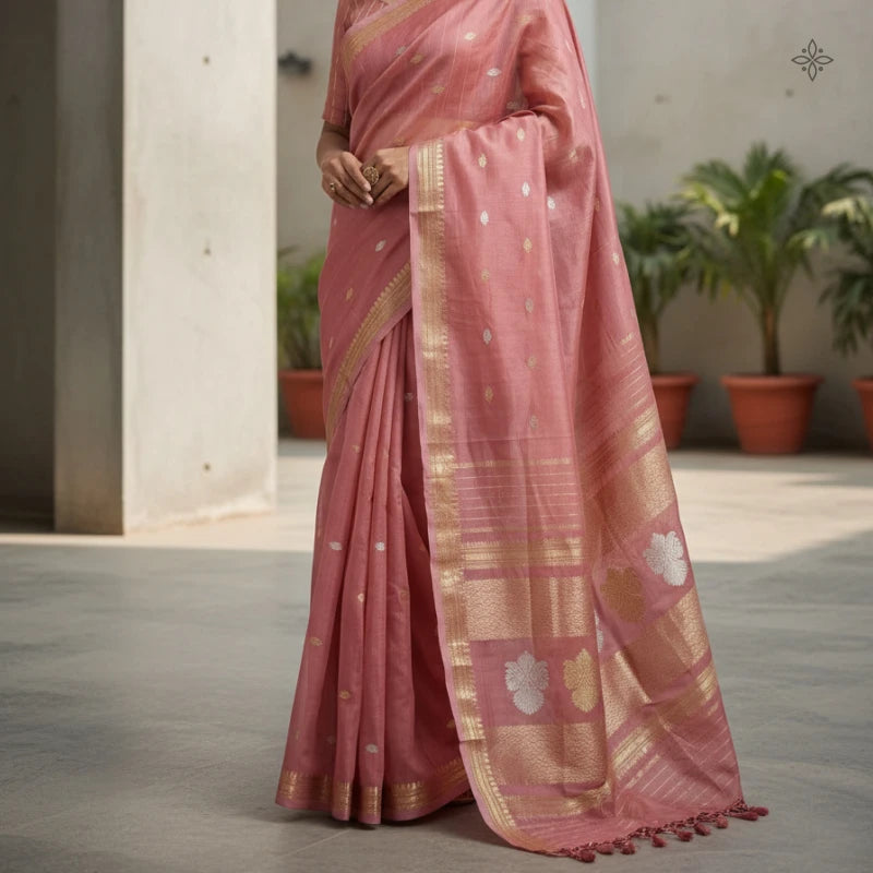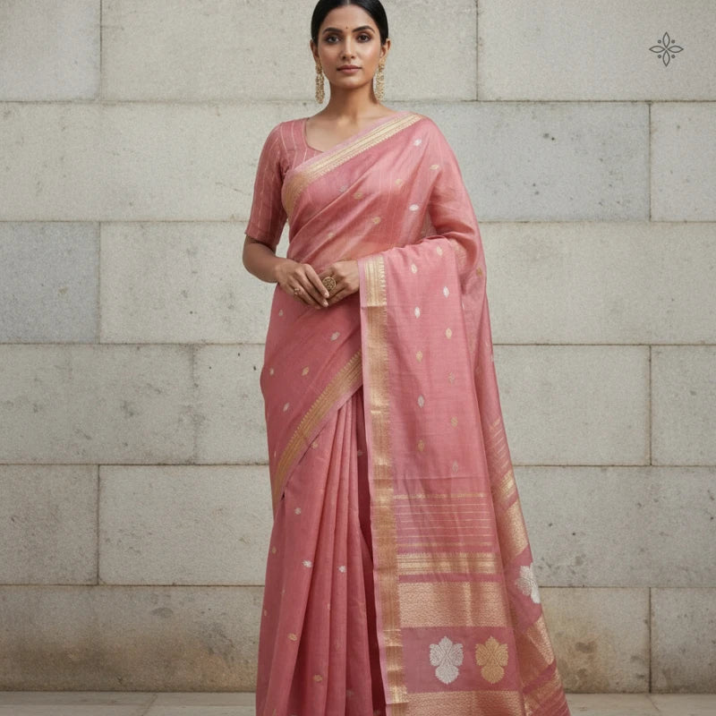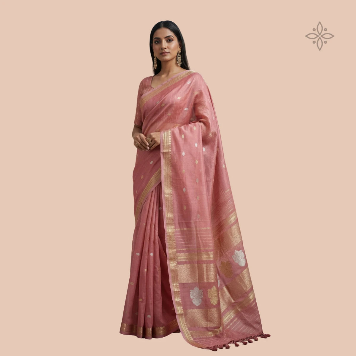 Sahira is a Chiniya silk saree in soft dusty rose, where silver and gold zari butis scatter across the body like quiet poetry. Gentle in colour, graceful in drape, and refined in every detail.