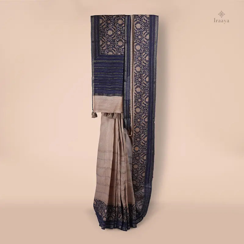 Step into understated luxury with Tvarita, an exquisite saree that gracefully blends the purity of Tussar and Muga silk with the intricate beauty of hand-done Katha embroidery. A timeless blend of calm and complexity – in muga-tussar silk with navy katha artistry.