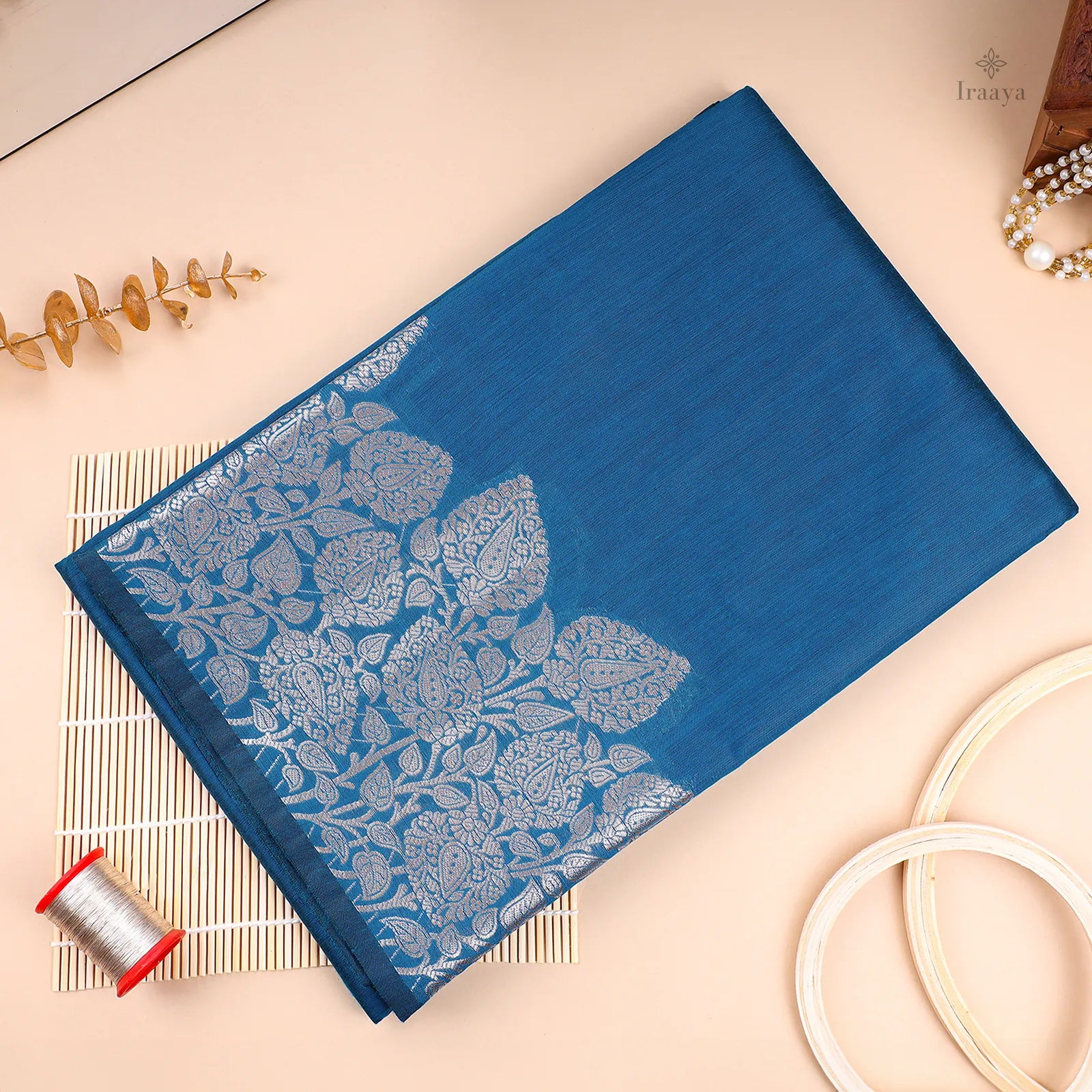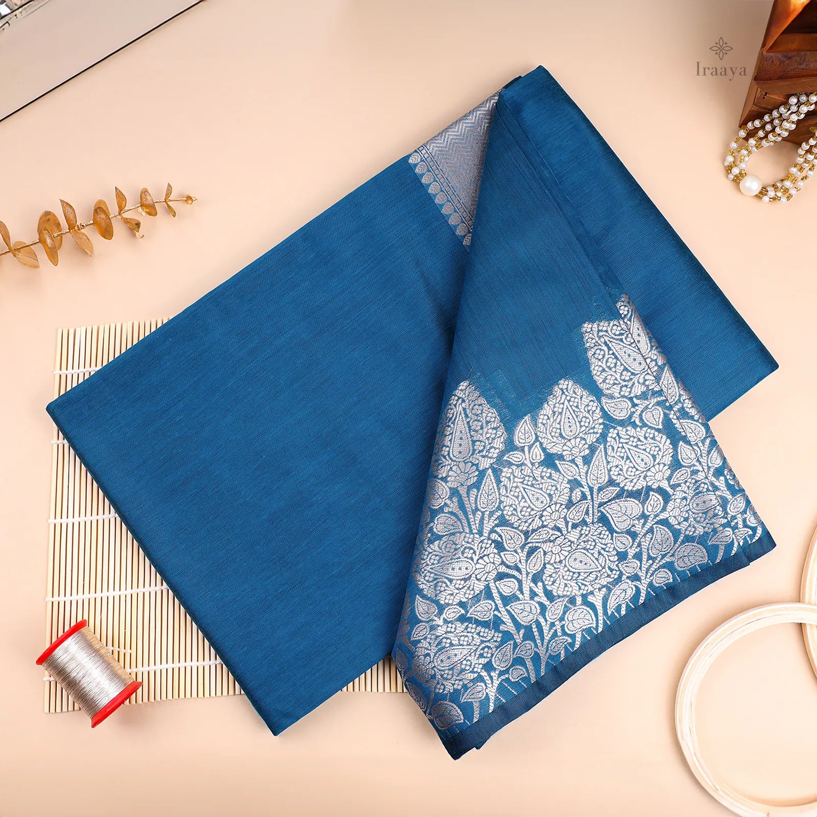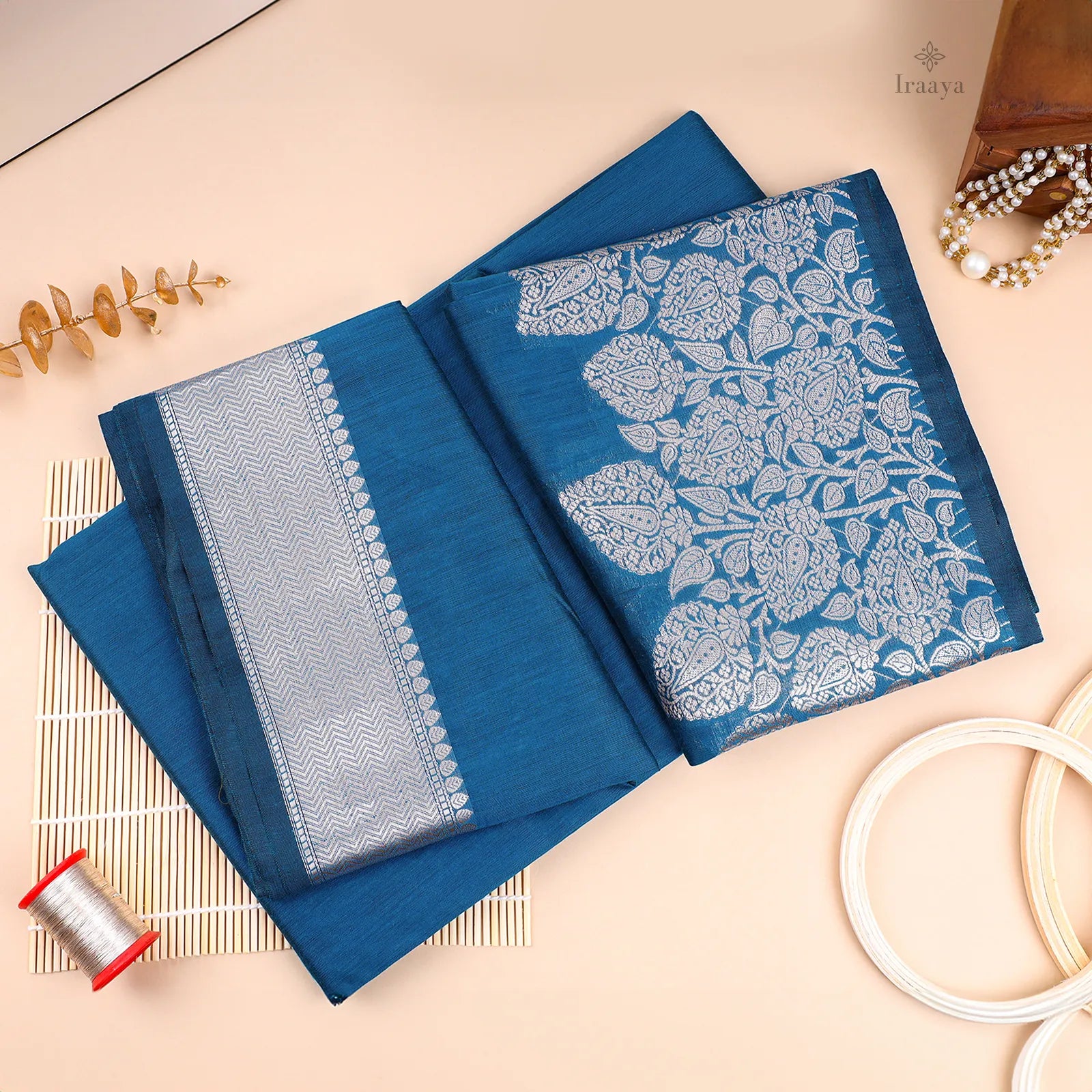 Color: Deep sapphire blue with silver zari motifs