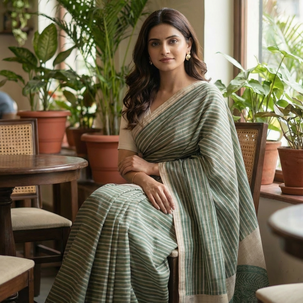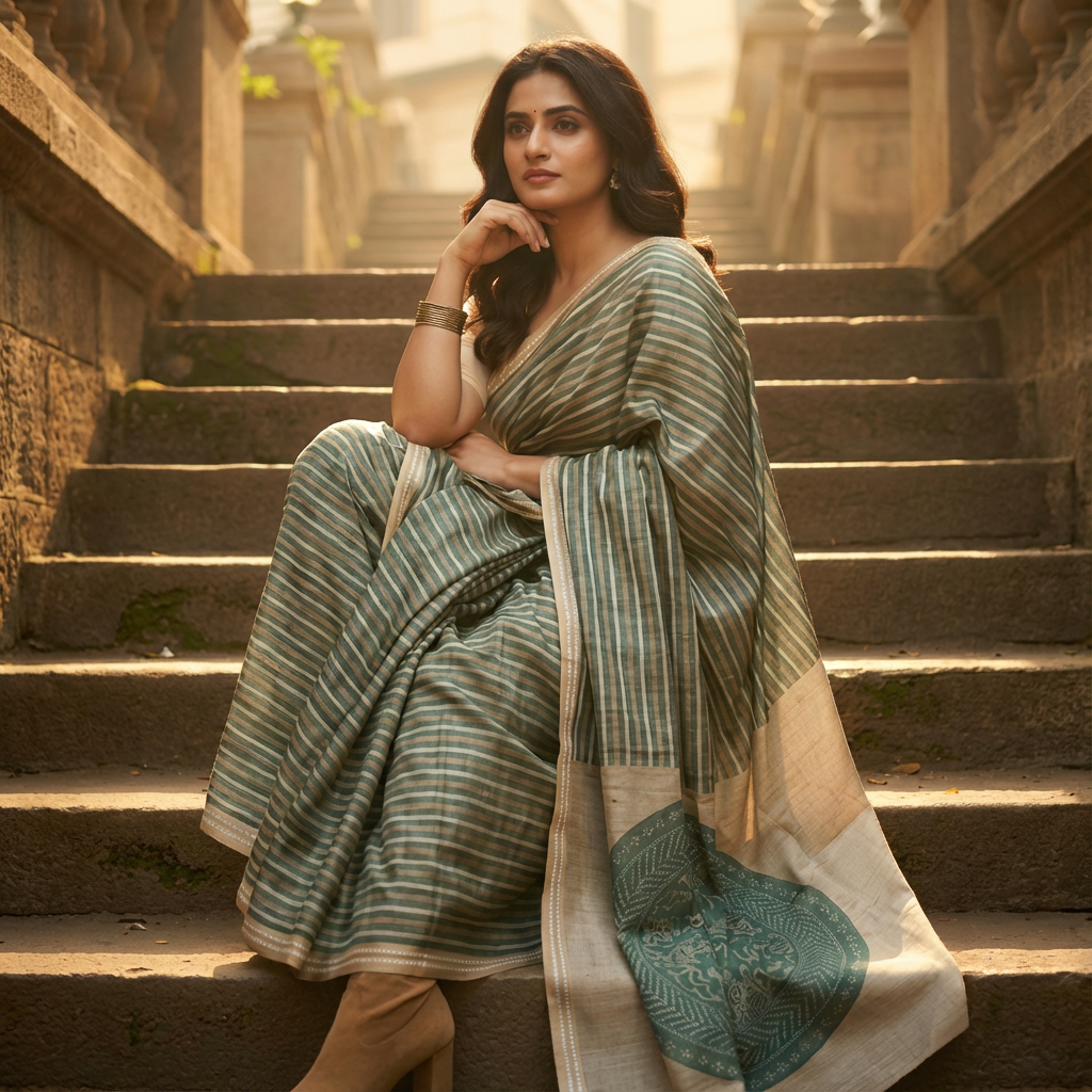 In a soothing palette of sage green and earthy beige, this saree brings together the quiet luxury of Tussar with a contemporary striped pattern that flatters every silhouette.